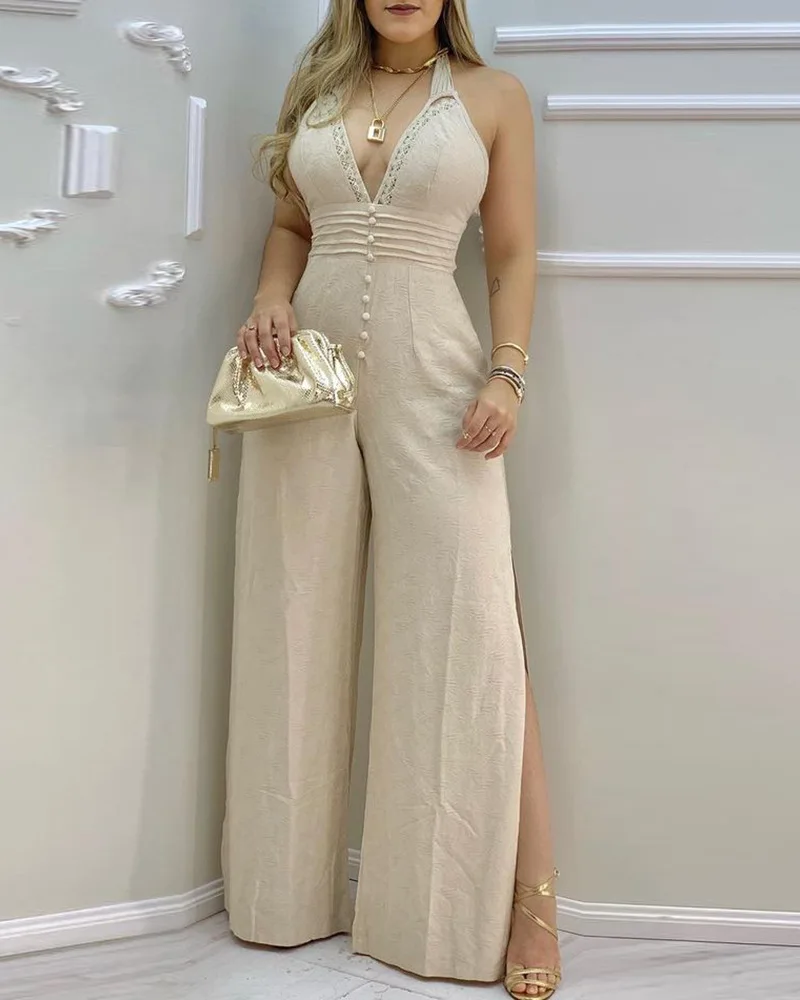O Macacão Camille é a definição de sofisticação com sensualidade na medida certa. Com decote profundo em V e detalhes de botões forrados na parte frontal, ele valoriza o colo e alonga a silhueta com muito charme. O modelo possui amarração nas costas, permitindo ajuste perfeito ao corpo, além de recortes laterais na perna que trazem movimento, leveza e um toque moderno ao look, feito em tecido leve e elegante, o Camille entrega conforto sem abrir mão da imponência.